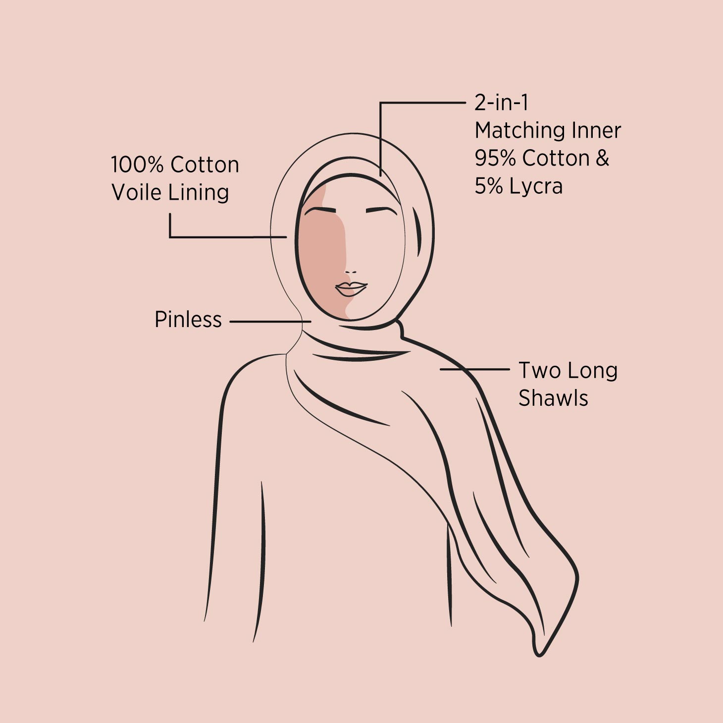 This ready-to-wear designer hijab is made of exclusive lightweight high-quality fabric and lined with 100% cotton voile to ensure breathability and comfort for hijabi women.