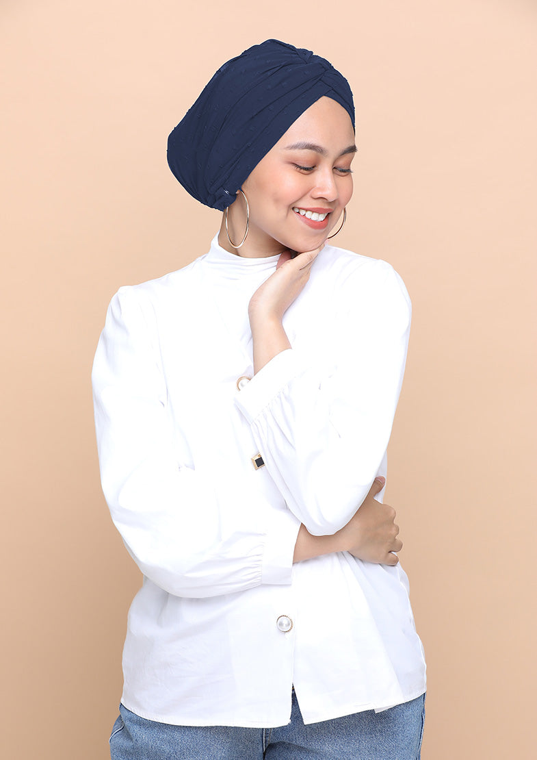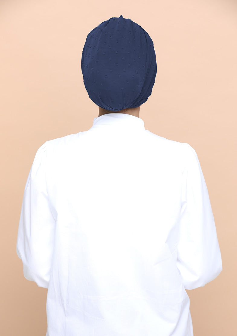 The dark cobalt color of this fabric dotted hijab makes it suitable for special evening gatherings and outings.