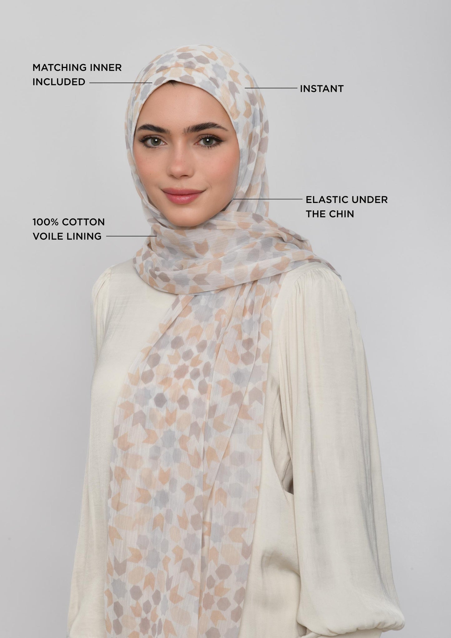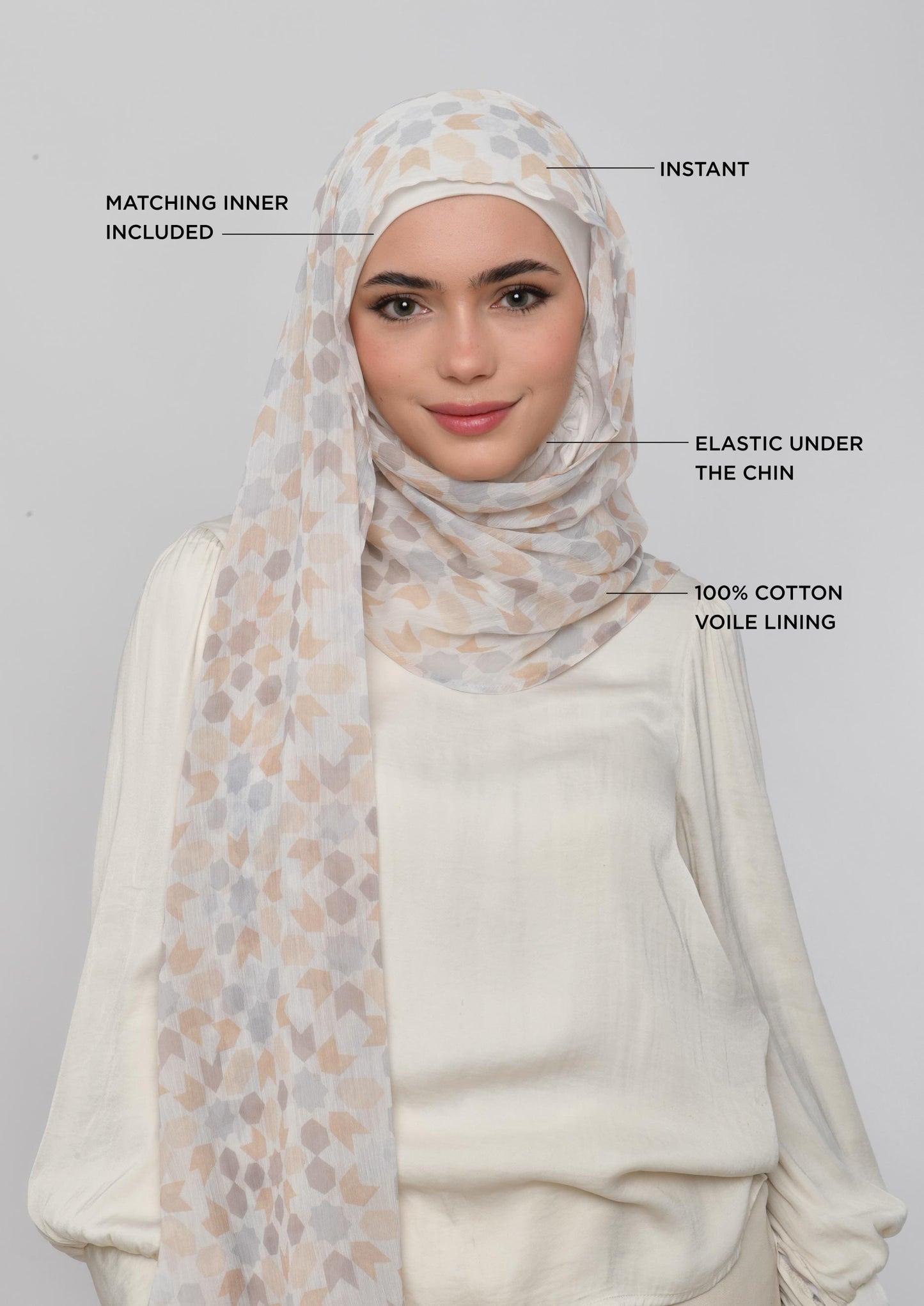 Get ready to shine with our Loulou hijab print, named after the Arabic word for pearl. This stunning piece features a small pattern geometric arabesque design in shades of cream, beige, and natural tones, creating a subtle yet glamorous look. ✨