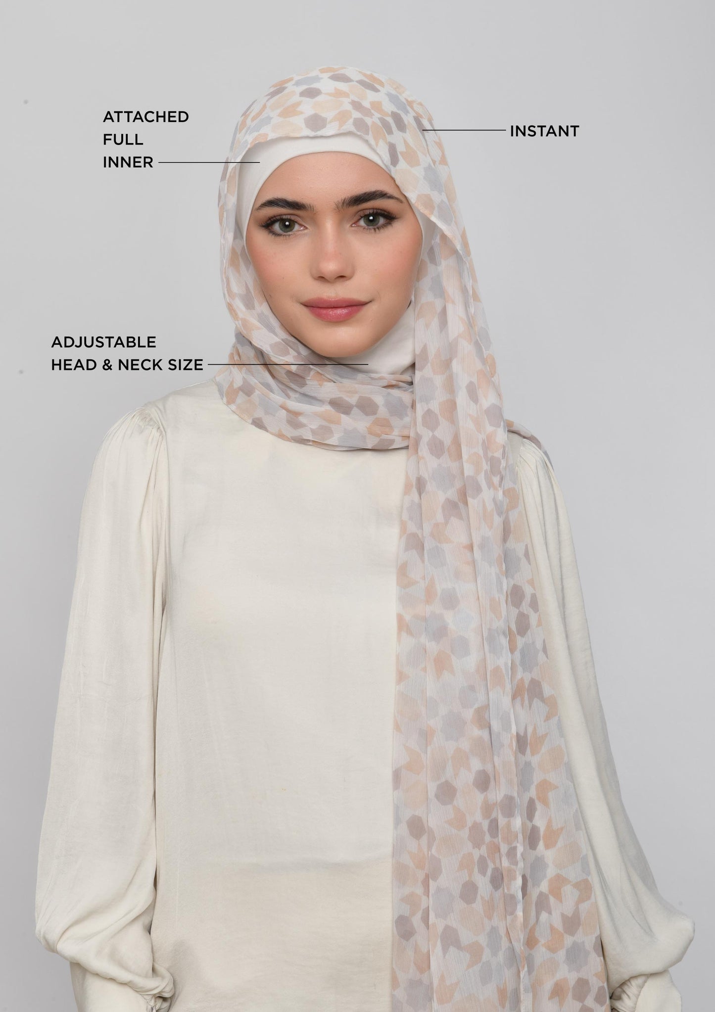 The Carre instant hijab style will let you achieve a neat square hijab look in no time. It features two pointy triangular shawl ends for flexible styling, and an elastic under chin to fit all head sizes.