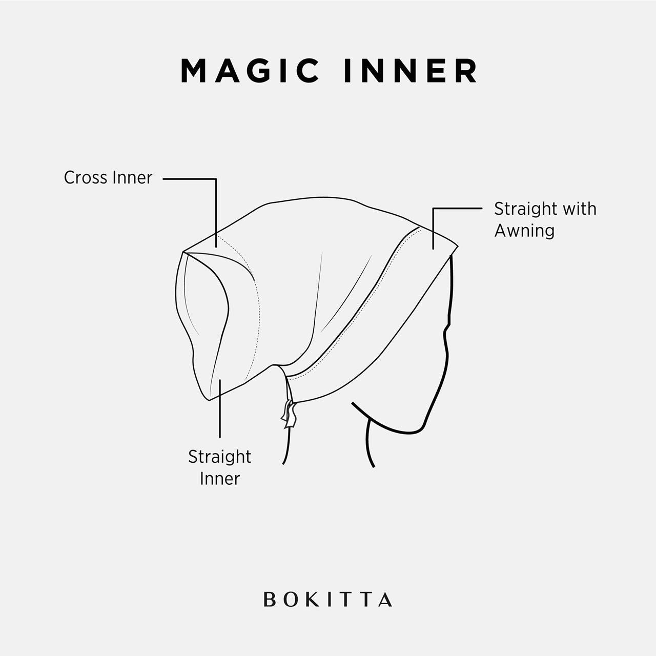 - It doesn’t require an inner, an adjustable full coverage inner (hair and neck) is already attached to the loose shawl.