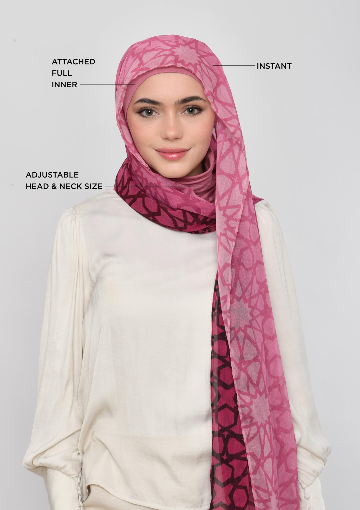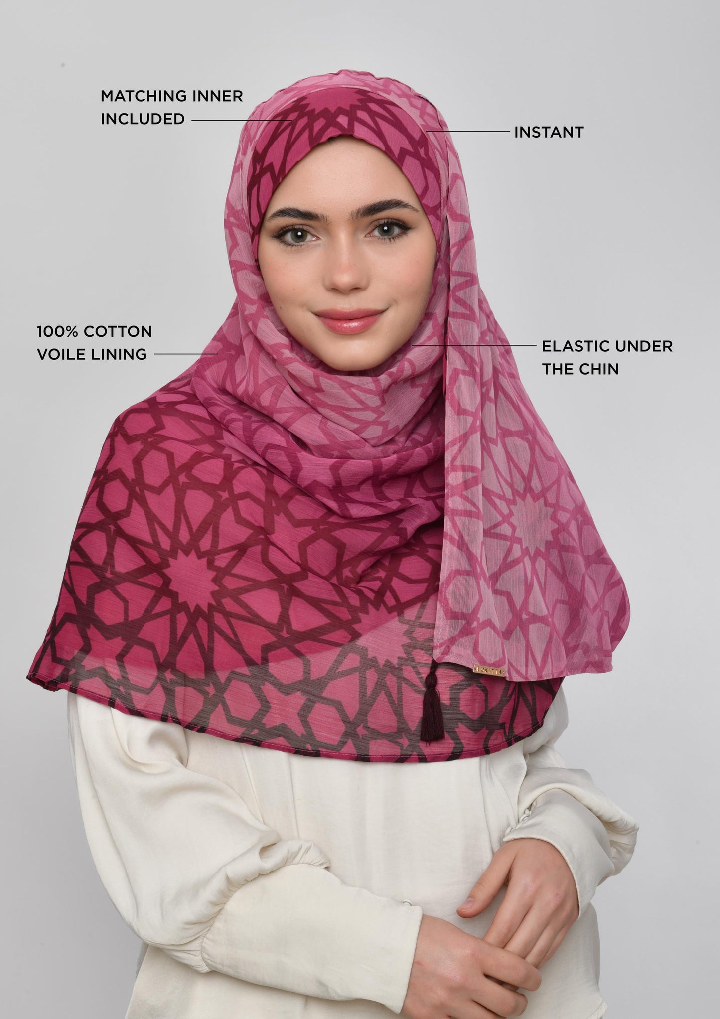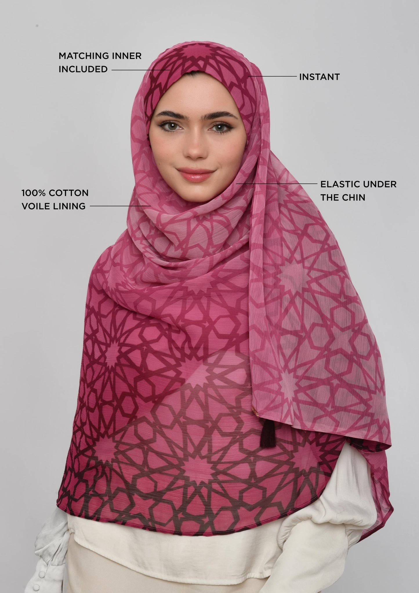 The Carre instant hijab style will let you achieve a neat square hijab look in no time. It features two pointy triangular shawl ends for flexible styling, and an elastic under chin to fit all head sizes.