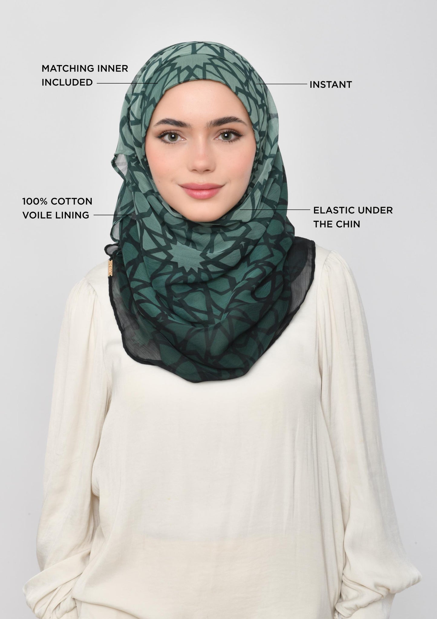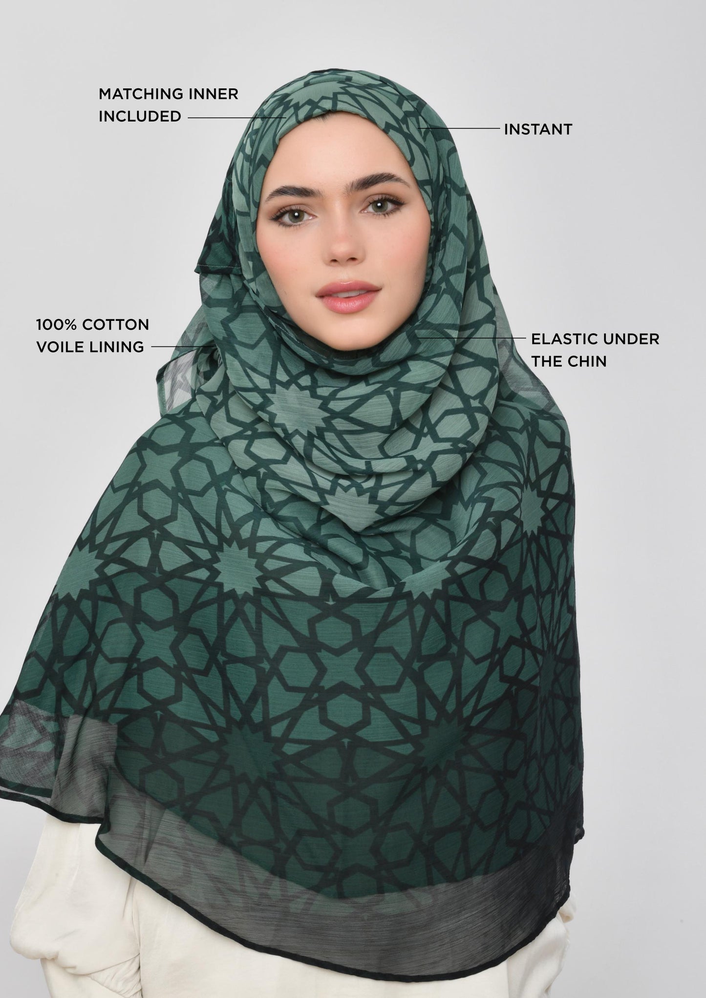 Experience the beauty of Islamic art with our 🌿 Zumurrud hijab print. The green gradient background adds a sense of calm and tranquility.